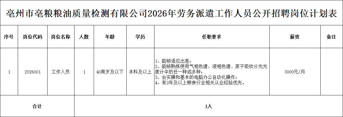 (一)本次招聘崗位系亳州市亳糧糧油質(zhì)量檢測有限公司2026年勞務(wù)派遣工作人員,錄用后與亳州市譙騰人力資源管理有限公司簽訂勞動合同,辦理手續(xù)后安排到相應(yīng)的崗位工作地點(diǎn)。試用期為2個月,試用期滿經(jīng)考核合格的,正式上崗,不合格的,予以辭退。